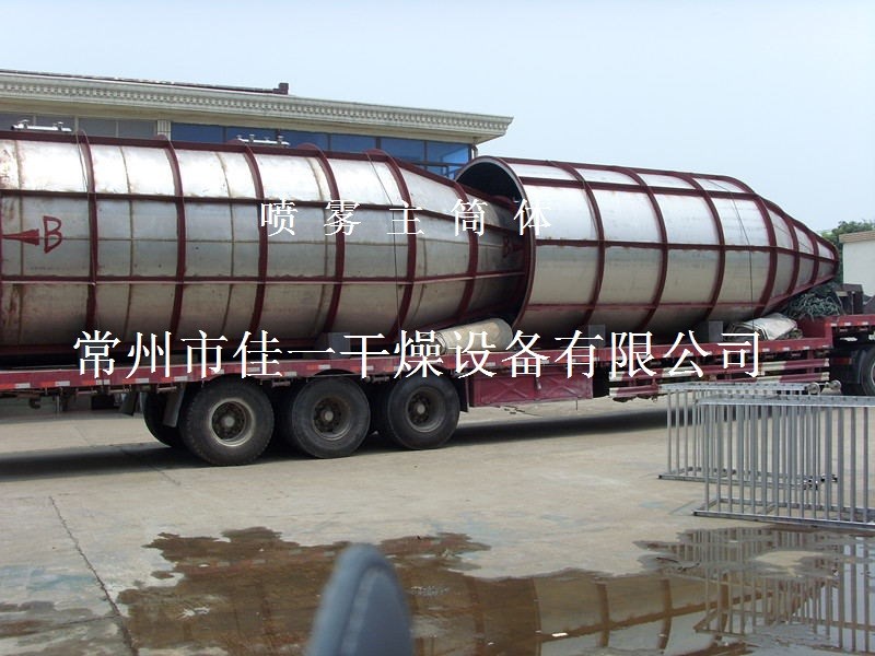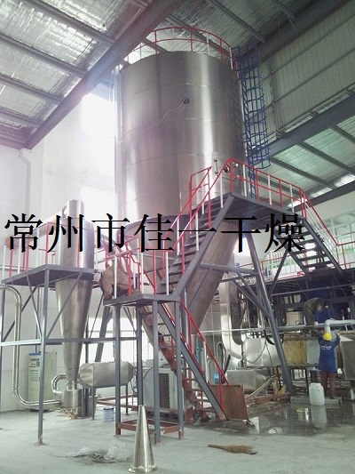 空氣經(jīng)過濾和加熱,進(jìn)入干燥器頂部空氣分配器,熱空氣呈螺旋狀均勻地進(jìn)入干燥室。料液經(jīng)塔體頂部的高速離心霧化器,(旋轉(zhuǎn))噴霧成極細(xì)微的霧狀液珠,與熱空氣并流接觸在極短的時(shí)間內(nèi)可干燥為成品。成品連續(xù)地由干燥塔底部和旋風(fēng)分離器中輸出,廢氣由風(fēng)機(jī)排空。
