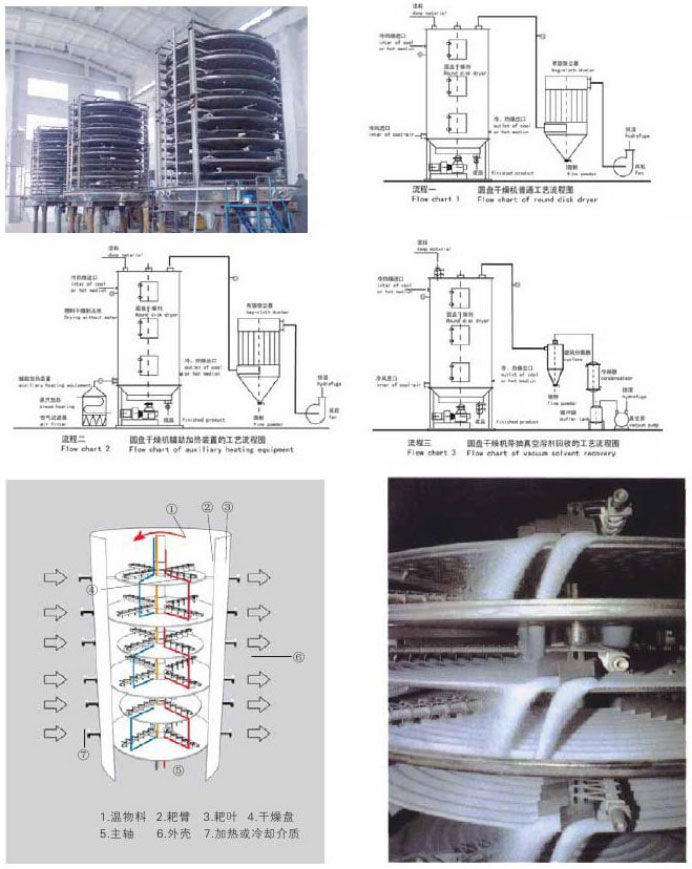 濕物料自加料器連續(xù)地加到干燥器上部第一層干燥盤上,帶有耙葉的耙臂作回轉(zhuǎn)運(yùn)動使耙臂作回轉(zhuǎn)運(yùn)動使耙葉連續(xù)地翻抄物料。物料沿指數(shù)螺旋線流過干燥盤表面,在小干燥盤上的物料被移送到外緣,并在外緣落到下方的大干燥盤外緣,在大干盤上物料向里移動并從中間落料口落如下一層小干燥盤中。大小干燥盤上下交替排列,物料得以連續(xù)地流過整個干燥器。中空的干燥盤內(nèi)通入加熱介質(zhì),加熱介質(zhì)形式有飽和蒸汽、熱水和導(dǎo)熱油,加熱介質(zhì)由干燥盤的一端進(jìn)入,從另一端導(dǎo)出。已干物料從最后一層干燥盤落到殼體的底層,最后被耙葉移送到出料口排出。濕份從物料中逸出,由設(shè)在頂蓋上的排濕口排出,真空型盤式干燥器的濕氣由設(shè)在頂蓋上的真空泵口排出。從底層排出的干物料可直接包裝。通過配加翅片加熱器、溶劑回收冷凝器、袋式除塵器、干料返混機(jī)構(gòu)、引風(fēng)機(jī)等輔機(jī),可提高其干燥的生產(chǎn)能力,干燥膏糊狀和熱敏性物 料,可方便地回收溶劑,并能進(jìn)行熱解和反應(yīng)操作。