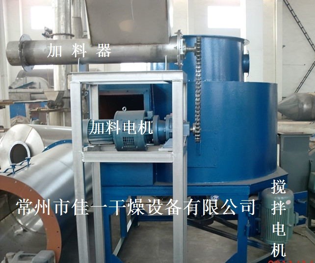 熱空氣切線進入干燥器底部,在攪拌器帶動下形成強有力的旋轉風場。膏狀物料由螺旋加料器進入干燥器內,在高速旋轉攪拌槳的強烈作用下,物料受撞擊、磨擦及剪切力的作用下得到分散,塊狀物料迅速粉碎,與熱空氣充分接觸、受熱、干燥。脫水后的干物料隨熱氣流上升,分級環將大顆粒截留,小顆粒從環中心排出干燥器外,由旋風分離器和除塵器回收,未干透或大塊物料受離心力作用甩向器壁,重新落到底部被粉碎干燥。