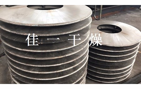 (2)轉子:整臺干燥機的承載部分,由一根中空軸和一組中空的圓盤組成。為提高圓盤的堅固性,空心內腔按環形布置幾組支撐桿。在圓盤的外邊緣裝有推進器/攪拌器,同時起到推進和攪拌物料的作用。