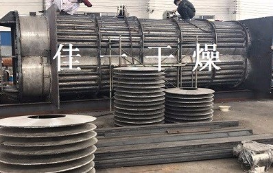 圓盤干燥機的主體由一個帶夾層的圓筒形外殼和一組中心相通的圓盤組成。帶夾層的圓筒形外殼和圓盤是中空的 熱介質從外殼夾層和圓盤中流過 污泥在圓盤與外殼內側之間通過污泥吸收圓盤和外殼內側傳導的熱量蒸發水分。污泥水分形成的水蒸氣聚集在圓盤上方的穹頂里被帶出干燥機。