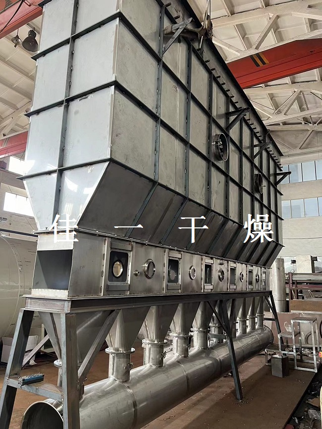 振動流化床(也稱直線振動流化床)干燥機是由物料自進料進口進入機內,在振動力作用下,物料沿水平面流化床拋擲,向前連續運動,熱風向上穿過流化床同濕物料換熱后,濕空氣經旋風分離器除塵后由排風排出,干燥物料由排料進口排出。適用于化工、制藥、食品、脫水蔬菜、糧食、礦產等行業的粉狀、顆粒狀物料的干燥、冷卻等作業。