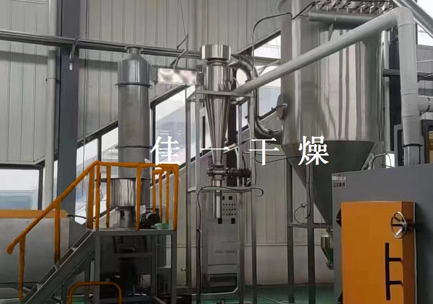 熱空氣切線進入干燥器底部,在攪拌器帶動下形成強有力的旋轉風場。膏狀物料由螺旋加料器進入干燥器內,在高速旋轉攪拌槳的強烈作用下,物料受撞擊、磨擦及剪切力的作用下得到分散,塊狀物料迅速破碎,與熱空氣充分接觸、受熱、干燥。脫水后的干物料隨熱氣流上升,分級環將大顆粒截留,小顆粒從環中心排出干燥器外,由旋風分離器和除塵器回收,未干透或大塊物料受離心力作用甩向器壁,重新落到底部被破碎干燥。